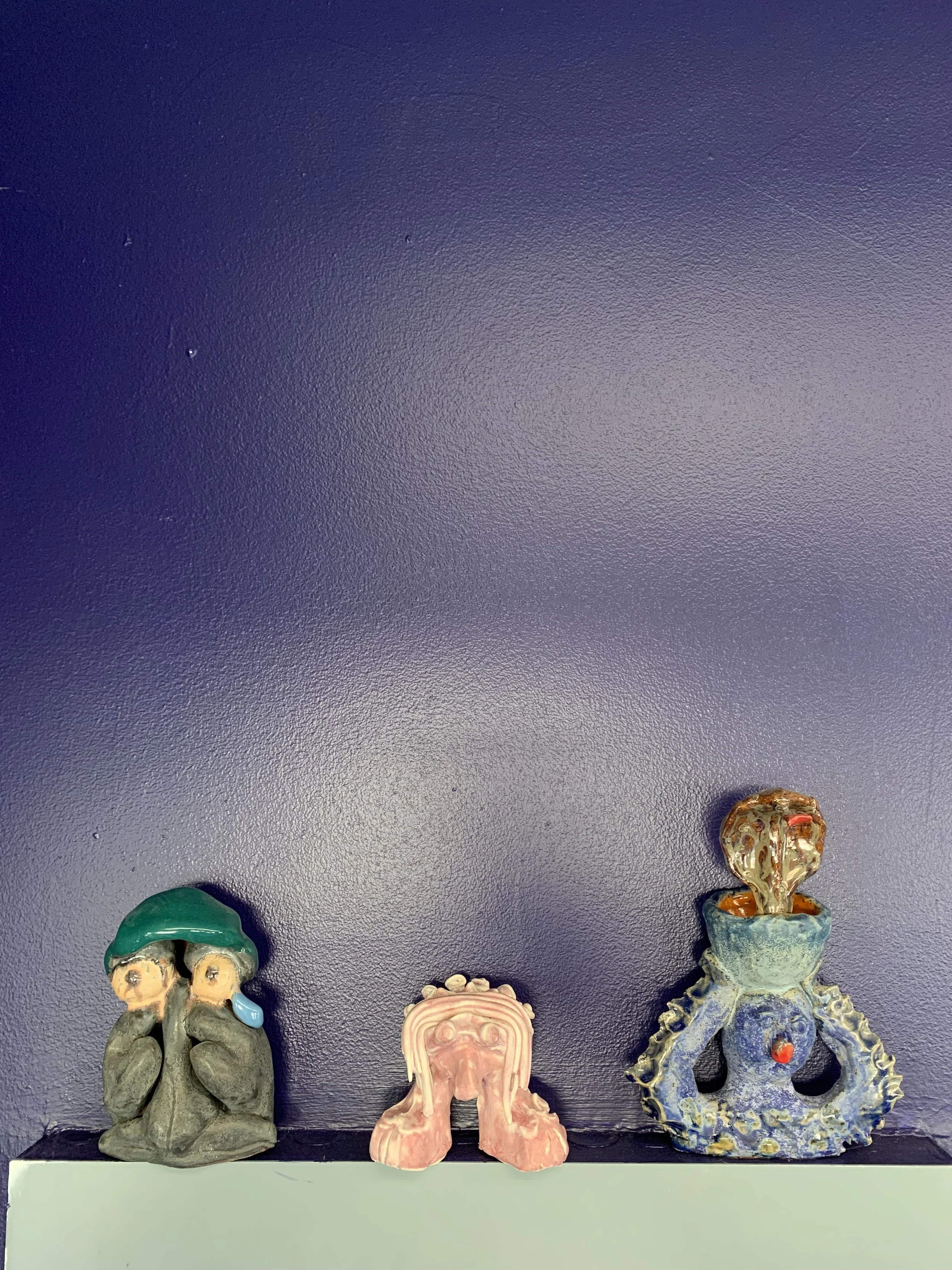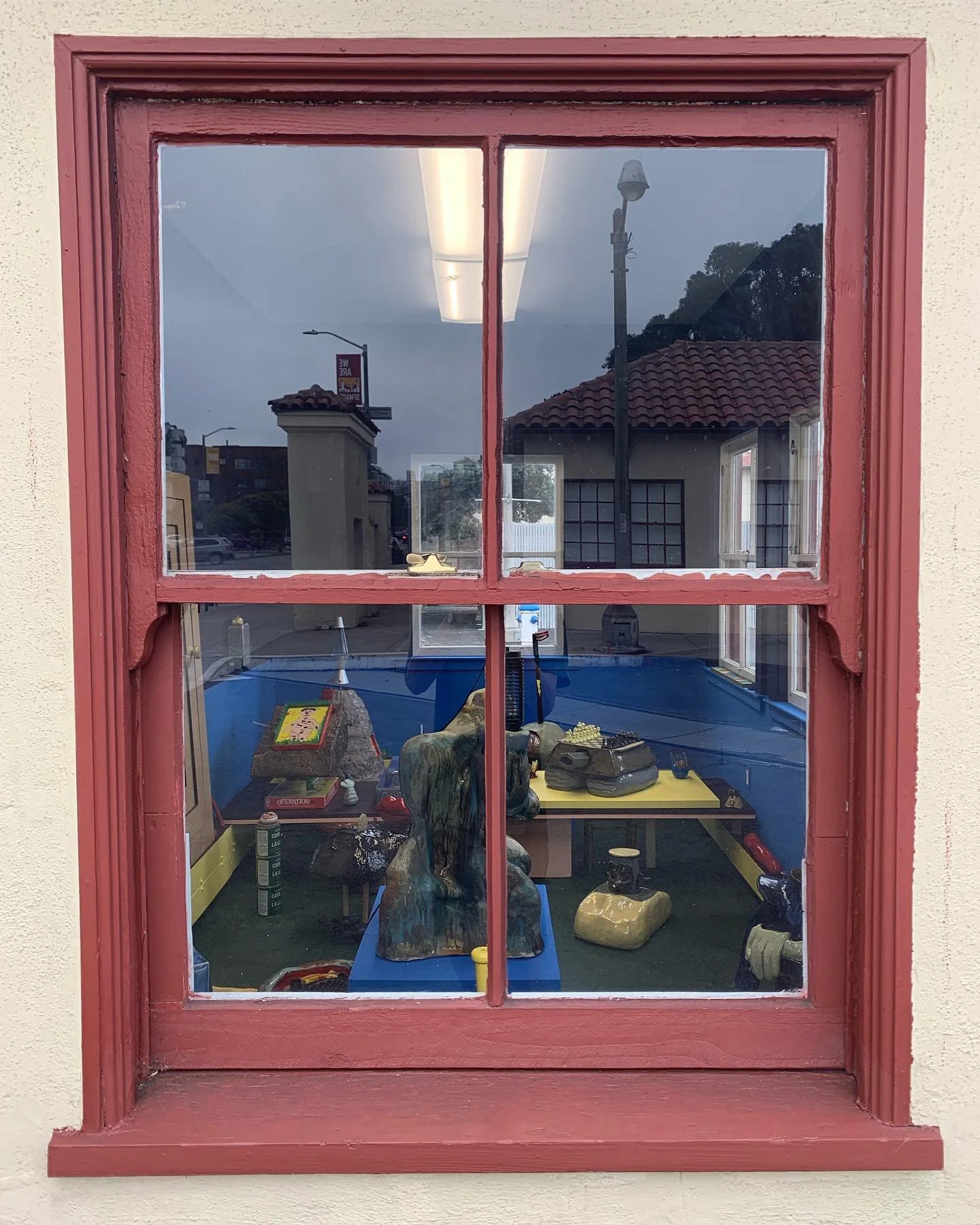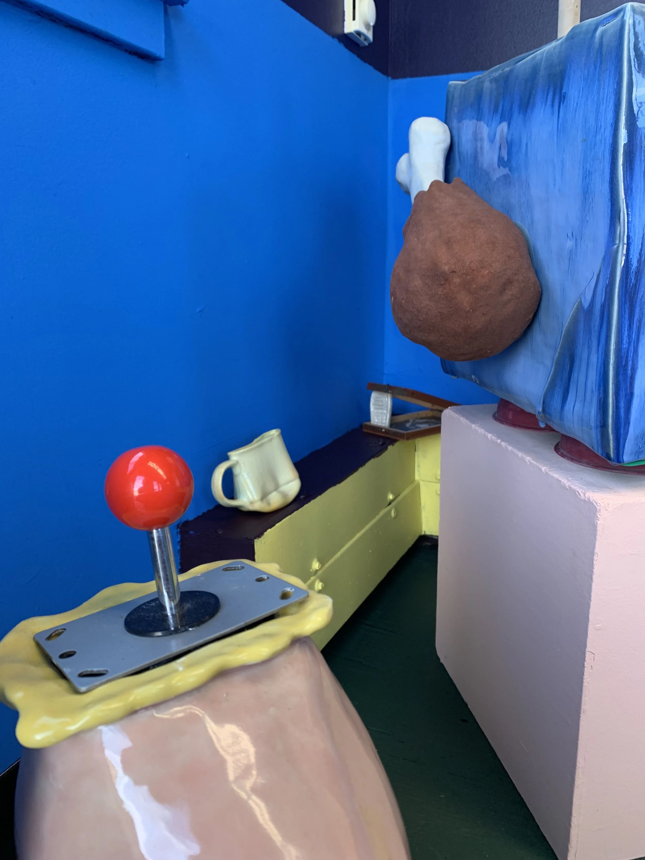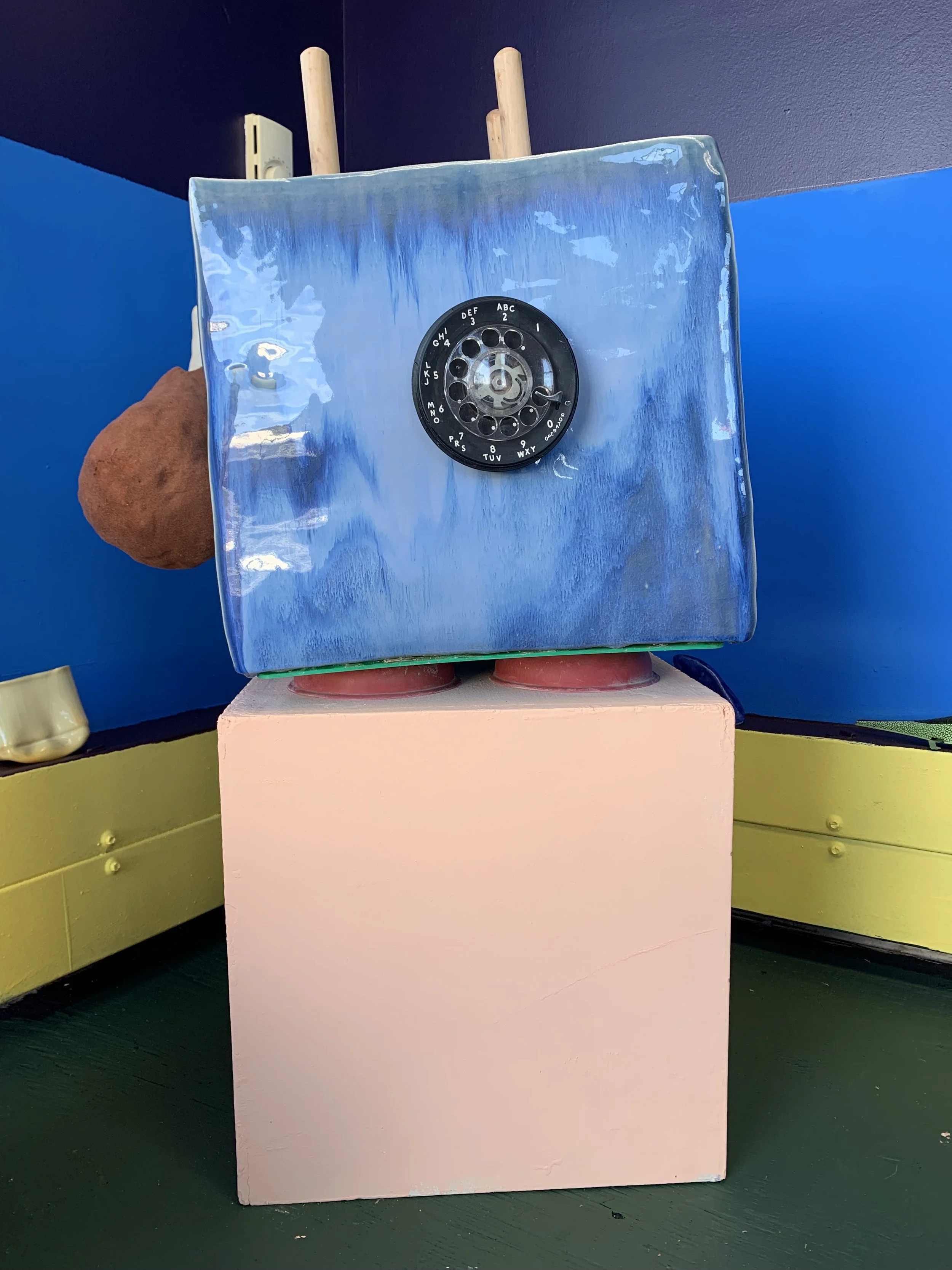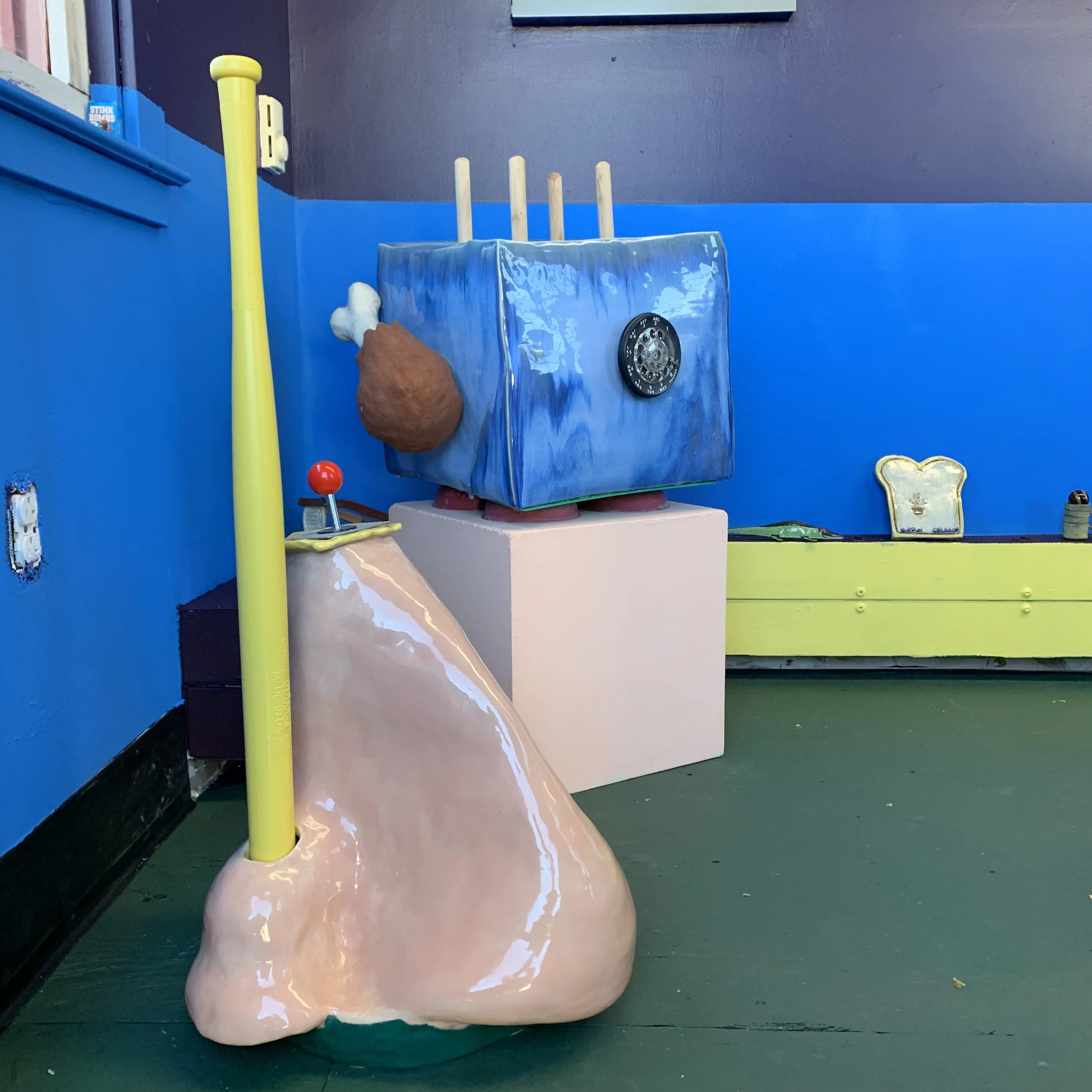 In KFG, the irreverence of Bay Area funk ceramics is expanded upon with broader material considerations, the relationship between objects across media, and the friction between the intimately caressed and cared-for material and the American consumer product. The coldness and ease of the online shopping click married to clay forms and their evidence of hand. The relationship of food-to-object through the longevity of the ceramic vessel and the short-lived yet over-sized consumer packaging of our snacks. Each work forms its own visual poem while the series provides insight into a practice of collecting, sourcing, and building a vocabulary of idiosyncratic art objects.